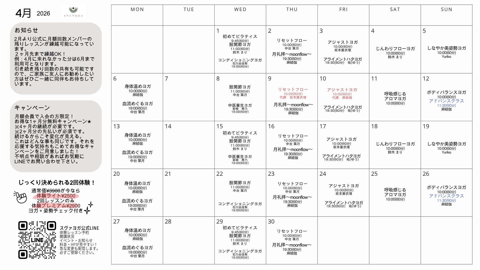 4月のスケジュールをアップいたします!最新はオンラインスケジュールをご確認くださいませ🙇‍♀️